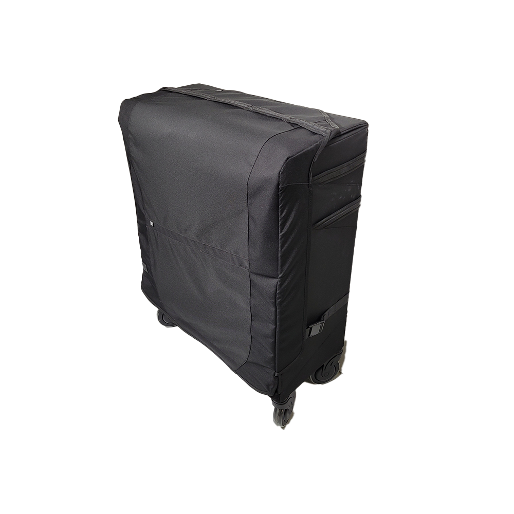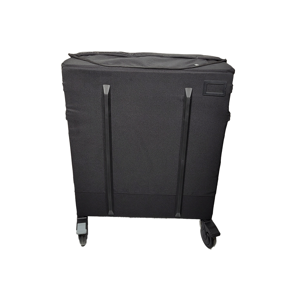 Ausgestattet mit 4 großen Rädern, davon 2 lenkbar, sowie einem integrierten Ablagefach für Tabletts oder Laptop.