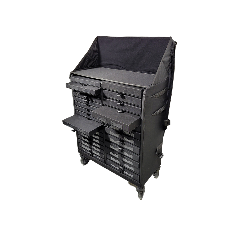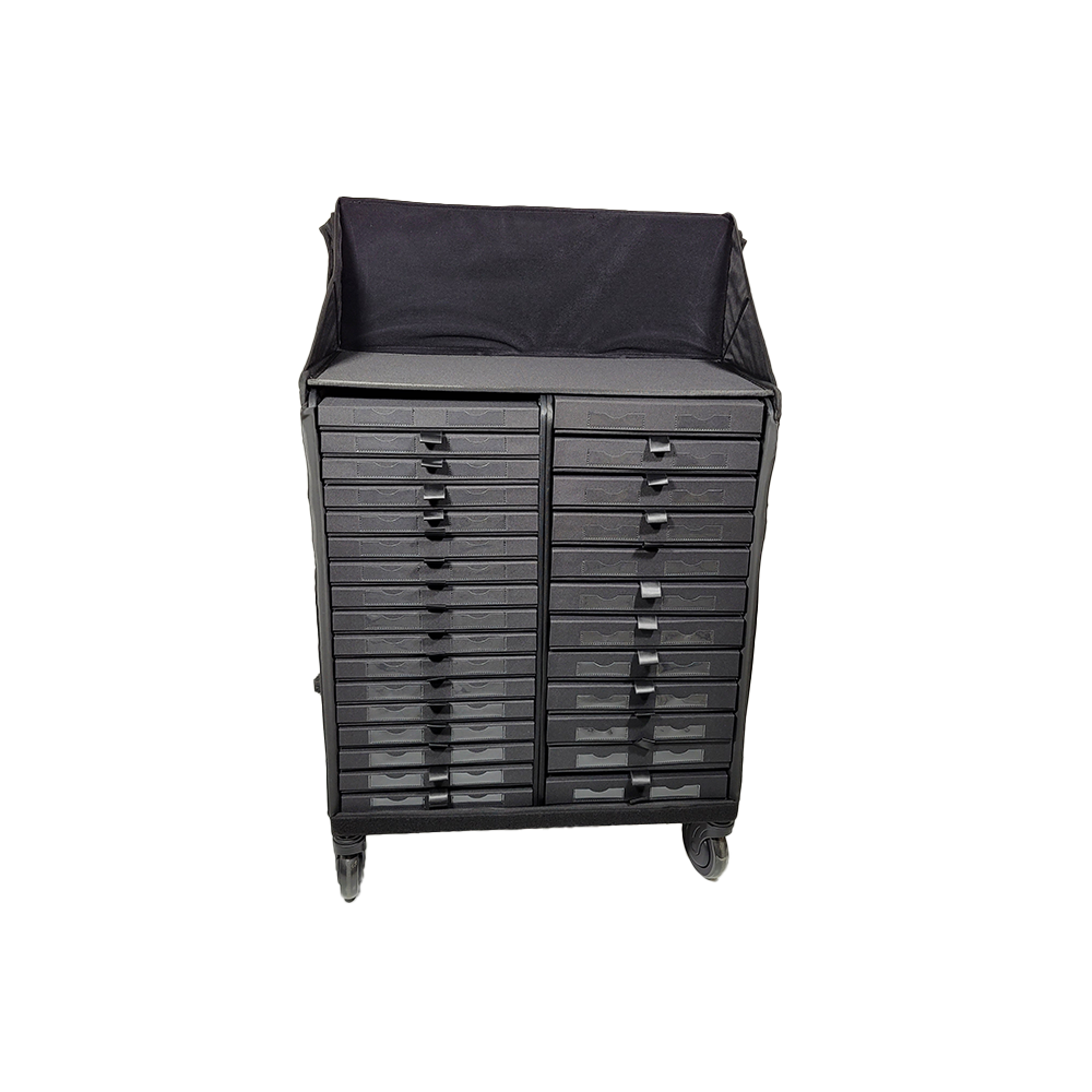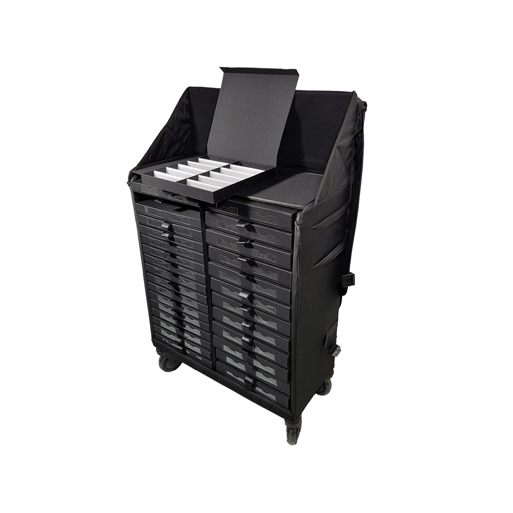 Entdecken Sie die COLLECTION BAG, ein rollendes Präsentationsmöbel, ideal für Showrooms, Messen und interne Unternehmensabteilungen (z. B. Marketing für Fotoshootings).