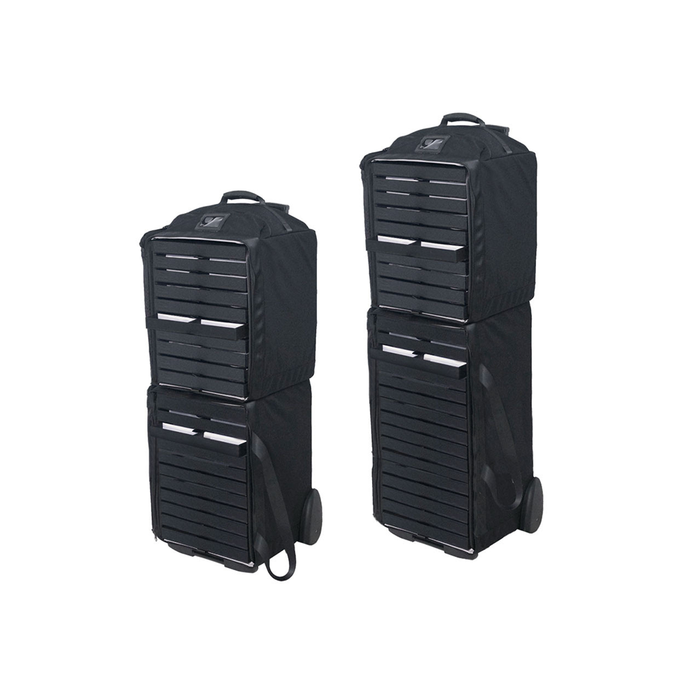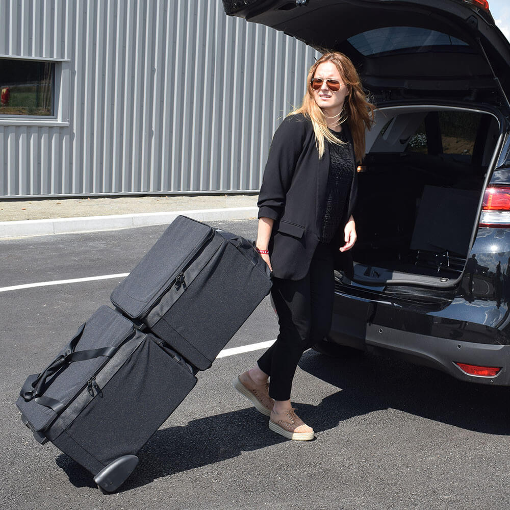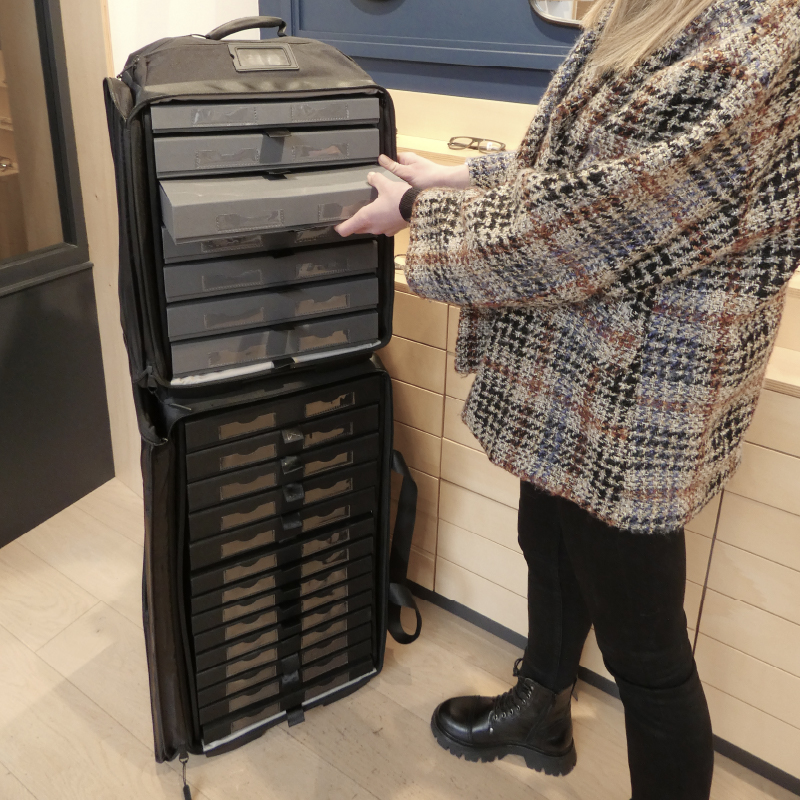 • Anpassungsfähigkeit und Kapazität : Bestehend aus zwei stapelbaren Taschen – einer mit Rollboden (erhältlich in 5 Größen: 440, 500, 600, 700 und 810 mm) und einer stapelbaren Tasche mit 440 mm –, wodurch der Transport von bis zu 312 Brillenfassungen möglich ist.